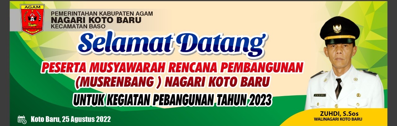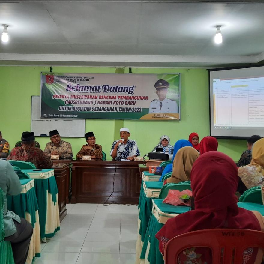 Telah dilaksanakan Musyawarah Rencana Pembangunan ( MUSRENBANG ) Nagari pada hari kamis tanggal 25 Agustus 2022 di Aula Kantor Walinagari Koto Baru yang di hadiri oleh Camat Baso,TA Kabupaten Agam, PD dan PLD Kecamatan, Walinagari beserta perangkat Nagari, BAMUS, wakil-wakil kelompok Masyarakat.