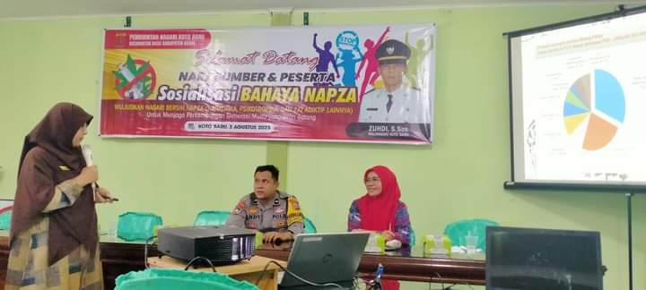 Pada hari Kamis, 03 Agustus 2023 telah dilaksanakan Sosialisasi tentang bahaya NAPZA di Aula Kantor Walinagari Koto Baru dengan narasumber Kasat Narkoba Polresta Bukittinggi yang diwakili oleh Bapak IPDA Widi Susanto dan dari Puskesmas Baso Ibu dr. Fitri Yarti,MM. Kegiatan sosialisasi ini dihadiri oleh Bapak Camat Baso yang diwakili oleh Ibu Devi Rina (Kesos), Ketua lembaga-lembaga nagari, Pangatuo Kampuang, Karang Taruna Mekar Lestari serta pemuda pemudi se Nagari Koto Baru.