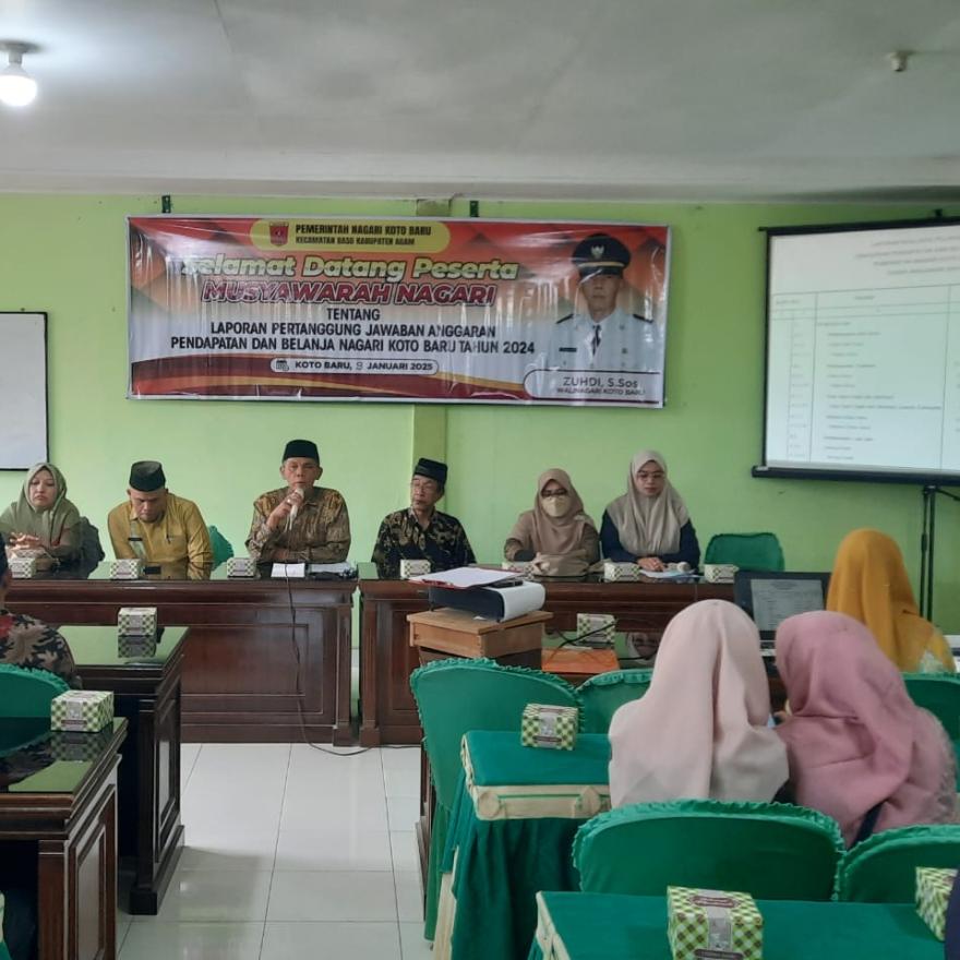 Pada hari ini kamis tanggal Sembilan bulan Januari tahun Dua Ribu Dua Puluh Lima di Aula Kantor Walinagari Koto Baru Kecamatan Baso Kabupaten Agam, telah dilaksanakan Musyawarah Nagari yang dihadiri oleh Forkopinca, PD/PLD, Bamus, Unsur-unsur Lembaga Nagari, Tokoh Masyarakat dan Pemuda/i Nagari Koto Baru sebagaimana tercantum dalam lampiran daftar hadir .