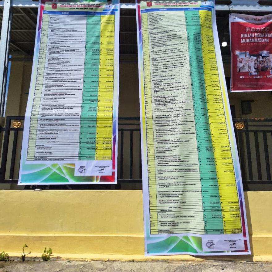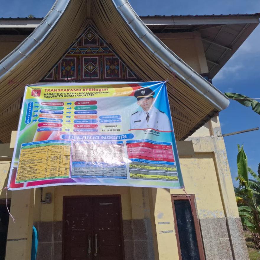 Telah dilaksanakan Penempelan spandukĀ Realiasai Pengunaan Dana Desa, Laporan Realisasi Pelaksanaan Anggaran Pendapatan dan Belanja Nagari Koto Baru Tahun 2025 dan Transparansi APBNagari Koto Baru Tahun 2026